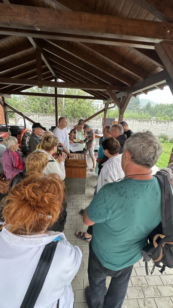 Další významnou zastávkou byla Včelařská základna v Ostrožské Lhotě. Zde mohli včelaři nahlédnout do zázemí naší práce a prozkoumat například náš Apidomek. Možnost vidět včely zblízka v tomto speciálním domku, často využívaném pro apiterapii a relaxaci, byla pro mnohé novým a fascinujícím zážitkem.